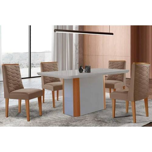 Conjunto Sala de Jantar Pietá c/ Tampo Madeirado c/ Vidro Canto Curvo 120x80cm e 4 Cadeiras Dafne Madeira Maciça Naturale/Off White - Capuccino/Suede - Conjunto Sala de Jantar Rufato com Tampo Madeirado e 4 Cadeiras