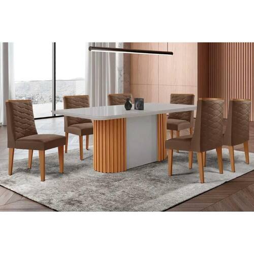 Conjunto Sala de Jantar Pilar c/ Tampo Madeirado c/ Vidro Canto Curvo 180x90cm e 6 Cadeiras Dafne Madeira Maciça Naturale/Off White - Capuccino/Suede - Conjunto de Sala de Jantar