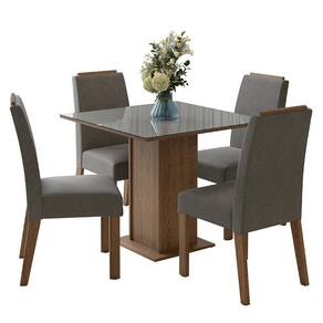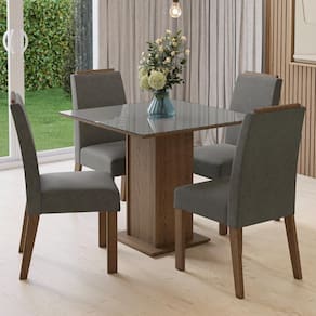 O conjunto conta com quatro cadeiras estofadas, com detalhe amadeirado no topo, que conferem sofisticação e mais durabilidade ao móvel. A mesa quadrada, com base em pedestal e tampo em MDP com vidro sobreposto, oferece estabilidade e uma superfície fácil de limpar, perfeita para o dia a dia.