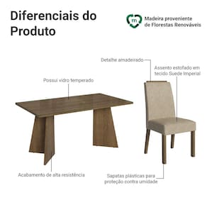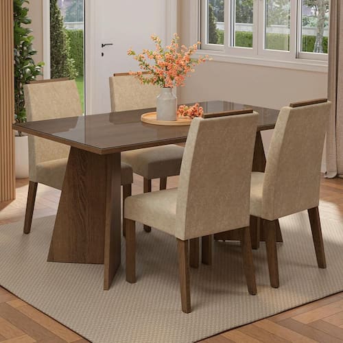 A mesa, com acabamento em tom amadeirado Rustic e tampo com vidro sobreposto, traz sofisticação e resistência, criando um visual moderno e elegante para o ambiente. As cadeiras, revestidas em tecido Suede Imperial, completam o conjunto com conforto e um toque de leveza.