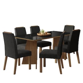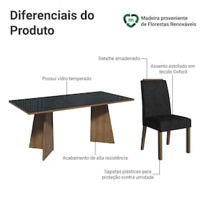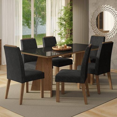 Com seis cadeiras estofadas em tecido Suede Oxford, cada detalhe, incluindo o acabamento amadeirado no topo, oferece elegância. A mesa, com base em formato trapézio, tampo na tonalidade preta e vidro incolor sobreposto, proporciona estabilidade e amplo espaço para acomodar toda a família, tornando cada refeição ainda mais agradável.