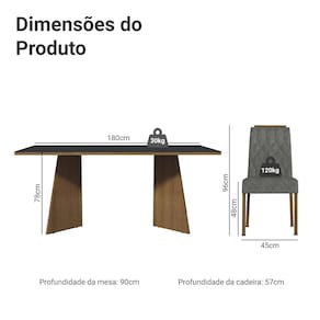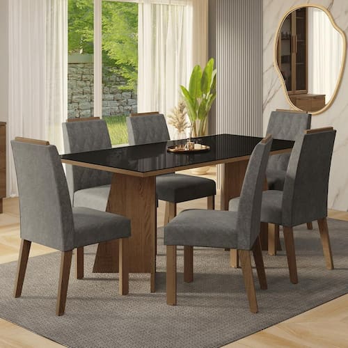 Com seis cadeiras estofadas, e o tampo de vidro sobreposto, para facilitar a limpeza no dia a dia. O conjunto oferece o espaço, conforto e sofisticação que sua família precisa. O diferencial está no detalhe amadeirado no topo das cadeiras, que valoriza ainda mais o design e proporciona maior durabilidade ao móvel.