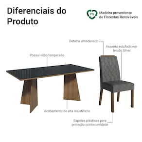 A estrutura da mesa é no acabamento amadeirado Rustic, o tampo em Preto e as cadeiras estofadas em tecido Suede Silver, criando um visual moderno. Ideal para quem busca unir beleza, funcionalidade e durabilidade em um único móvel.