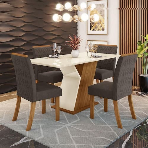 FICHA TECNICA: Escala de Brilho Cadeiras: Fosco Cadeiras Possui Rodizio: Nao Peso Suportado por Cadeira: 120 Kg Estrutura Assento: MDP/MDF Altura Assento ate o chao: 44,5 Cm Revestimento Assento: Na versao Marrom o tecido e Suede Enchimento Assento: Espuma D23 Almofada Assento: Fixa Tipo Assento: Fixa Estrutura Encosto: MDP/MDF Revestimento Encosto: Na versao Marrom o tecido e Suede Enchimento Encosto: Espuma D15 Tipo Encosto: Fixa Material dos pes: MDF Medidas por Cadeiras Montada (A x L x P): 95 x 44 x 57,5 Cm Peso por Cadeira Montada: 7,5 Kg Acabamento Base Mesa: Pintura UV Texturizada no Nature e Pintura UV no Off White Acabamento Tampo Mesa: Pintura UV Escala Brilho Tampo Mesa: Brilho Escala Brilho Base Mesa: Fosco no Nature e Brilho no Off White Material Base Mesa: MDP Material Principal Mesa: MDP/MDF Mesa Suporta Ate: 40 Kg Mesa Extensivel: Nao Formato Tampo: Retangular Material Tampo: MDF Medida Tampo (L x C x E): 80 x 160 x 2,5 Cm Possui Vidro: Sim Vidro Temperado: Nao Tamanho Vidro (L x C x E): 80 x 160 x 0,4 Cm Medidas Mesa Montada (A x L x P): 80 x 80 x 160 Cm Peso Mesa Montada: 63 Kg