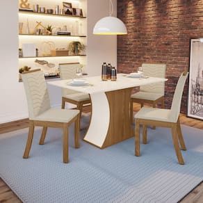 O conjunto para sala de jantar Brenda foi projetado para proporcionar praticidade e funcionalidade, alem de embelezar o ambiente, vai garantir conforto durante suas refeicoes. A mesa possui tampo de canto reto sem vidro e conta com 4 cadeiras estofadas.