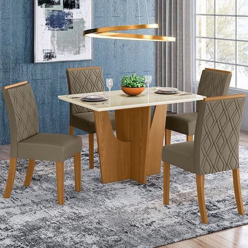 O conjunto para sala de jantar Andressa foi projetado para proporcionar praticidade e funcionalidade, além de embelezar o ambiente, vai garantir conforto durante suas refeições. A mesa possui tampo de 1.200X800mm canto reto com vidro Off White e conta com 04 cadeiras estofadas.