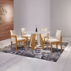 Na hora de receber visitas para refeições em casa você não quer se preocupar com mais nada além do cardápio, certo? Então para ter certeza de que seus convidados se sentirão bem recepcionados invista no Conjunto de Mesa de Jantar Grécia com cadeiras Mônaco, um kit completo e com tudo o que você precisa para um evento perfeito: 4 cadeiras aconchegantes, tampo amplo e um design de encher os olhos. Além do visual moderno, a combinação de cores forma ainda um móvel daqueles dignos de muitos elogios e que será palco para ótimos momentos. Medida da Mesa (A x L x P): 80cm x 110cm x 110cm Peso da Mesa: 39,2 kg Mesa suporta até: 50.0000 Acabamento da Cadeira/Banco: Pintura UV Acabamento da Mesa: Pintura UV Ambiente Principal: Sala de Jantar Cadeira/Banco Estofada: Encosto e Assento Estofados Cadeira/Banco estofada: Encosto e Assento Estofados Cadeira/Banco suporta até: 120.0000 codigo_ean: 7900288156679 Complexidade da Montagem: Média: pode ser montado por mais de uma pessoa e/ou necessite de maior conhecimento para montagem Cor: Cinamomo/Creme/Off White Cor do Produto: Cinamomo/Creme/Off White Cor Secundária: Marrom De Canto (Canto Alemão): Não Enchimento do Assento: Espuma D-20 Enchimento do Encosto: Espuma D-18 Escala de Brilho: Semi-Fosco Espessura do Tampo: 25 mm Formato do Tampo: Redondo Itens Inclusos: 1 Mesa, 4 Cadeiras, Kit Ferragens e Manual de Montagem Linha ou Coleção: Mônaco Manual de Especificação Técnica: https://product-hub-prd.madeiramadeira.com.br/384367289/documents/8f6b5dd2-a8a1-40ff-99f0-d4f93c9c7dd02945941286817479352613842.pdf Manual de Montagem e Instalação: https://product-hub-prd.madeiramadeira.com.br/384367289/documents/80162e72-e093-4ff6-9f03-3a1c753b235d294566828681747932130983.pdf Marca: LJ Móveis Material da Base da Mesa: MDF/MDP Material da Estrutura da Cadeira: MDF/MDP Material do Tampo: Vidro/MDF Material Principal: Madeira/MDF Medida da Cadeira/Banco (A x L x P): 90cm x 45cm x 60cm Medida do Tampo (L x C x E): 110cmx110cmx2,5cm Mesa Extensível: Não Necessita Montagem: Sim Origem do Produto: Nacional Peso da Cadeira/Banco: 8,85 kg Possui Apoio para Braços: Não Possui Apoio Para os Pés: Não Quantidade de Cadeiras: 4 Quantidade de Lugares: 04 Recomendações de Uso, Manutenção e Limpeza: Para melhor conservação do seu móvel, não utilizar produtos de limpeza. Utilizar somente levemente úmido. Revestimento da Cadeira/Banco: Suede Sistema de Montagem: 1 Mesa, 4 Cadeiras, Kit Ferragens e Manual de Montagem