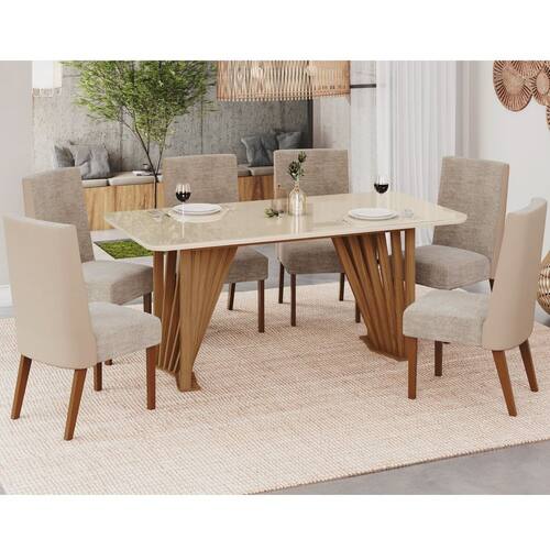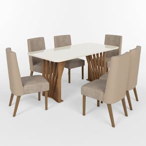 Conjunto Sala Jantar Adriana 180cm Canto Arredondado com Vidro + 6 Cadeiras Anne Marrom/Off White/Bege