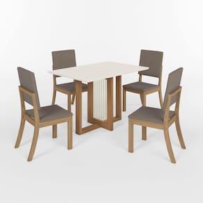 O Conjunto Sala Jantar Natali Canto Reto com 4 cadeiras é uma solução prática e elegante para espaços de jantar mais compactos. Com um design de canto reto, a mesa é projetada para otimizar o espaço disponível, ideal para ambientes menores ou para quem deseja uma configuração mais eficiente. O conjunto é fabricado com materiais de qualidade, oferecendo durabilidade e fácil manutenção. As cadeiras complementares são confortáveis e estilosas, proporcionando um ambiente agradável para refeições em família ou entre amigos. Este conjunto combina funcionalidade e estilo, sendo uma escolha versátil para qualquer sala de jantar moderna. Medida da Mesa (A x L x P): 80 x 120 x 80 Cm Peso da Mesa: 65 kg Mesa suporta até: 40 kg Acabamento da Cadeira/Banco: Pintura Texturizada Acabamento da Mesa: Pintura UV Acompanha Manual de Instalação: Sim Almofada do assento: Fixa Altura do Conjunto: 94,5 cm Ambiente Principal: Sala de Jantar Cadeira/Banco estofada: Encosto e Assento Estofados Cadeira/Banco suporta até: 120 kg Complexidade da Montagem: Média: pode ser montado por mais de uma pessoa e/ou necessite de maior conhecimento para montagem Cor: Marrom/Off White/Marrom Cor da Base: Marrom Cor do Produto: Marrom/Off White/MarroM Cor do Tampo: Off White Cor Secundária: Marrom De Canto (Canto Alemão): Não Enchimento do Assento: Espuma D-18 Enchimento do Encosto: Espuma D-15 Escala de Brilho: Brilhante Espessura do Tampo: 2,5 mm Estrutura do Assento: MDP/MDF Estrutura do Encosto: MDP/MDF Formato do Tampo: Retangular Informações Complementares: • Tampo com Acabamento em usinagem negativa; • Borda Reta com Pintura Laqueada que garante mais Resistência e durabilidade; • Vidro com pintura em Off White e canto Reto acompanhando o acabamento do Tampo; Itens Inclusos: 1 Sala de Jantar Natali, Kit Ferragens e Manual de Instruções Linha ou Coleção: Natali Manual de Montagem e Instalação: https://product-hub-prd.madeiramadeira.com.br/922010/documents/f1d1634c-ab93-4426-9538-1927526c61b92130245432517204619002648.pdf Material da Base da Mesa: MDP Material da Estrutura da Cadeira: MDF/MDP Material do Tampo: MDF Material Principal: MDF Material Principal das Cadeiras/Bancos: MDF/MDP Medida da Base (A x L x P): (A x L x P) 77,5 x 93 x 50 Cm Medida da Cadeira/Banco (A x L x P): (A x L x P) 94,5 x 41,5 x 53,5 Cm Medida do Tampo (L x C x E): (A x L x P) 80 x 120 x 2,5 Cm Mesa Dobrável: Não Mesa Extensível: Não Necessita Montagem: Sim Origem do Produto: Nacional Peso da Cadeira/Banco: 7,25 kg Possui Apoio para Braços: Não Possui Apoio Para os Pés: Não Possui Prateleiras: Não Possui Rodízio: Não Possui Vidro: Sim Quantidade de Cadeiras: 8 Quantidade de Lugares: 04 Recomendações de Uso, Manutenção e Limpeza: Para limpeza de seu móvel, use uma flanela seca ou umedecida. Não utilize produtos químicos que possam danificar o produto. Revestimento da Cadeira/Banco: Suede Sistema de Montagem: Parafusos e Cavilhas Tipo de Assento: Fixo Tipo de Encosto: Fixo