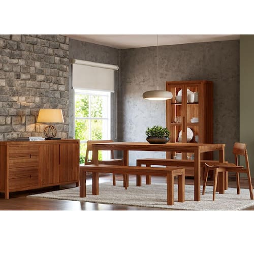 Conjunto Sala Jantar Nature: Cristaleira, Buffet, Mesa, Banco e Cadeiras Rústico Escuro Madeira Pinus