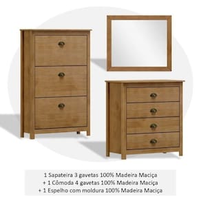 Produzido 100% em madeira maciça de pinus com acabamento em verniz PU/UV acetinado na cor Freijó. A sapateira mantém calçados organizados e acessíveis, a cômoda com quatro gavetas com corrediças telescópicas acomoda roupas e objetos pessoais, enquanto a moldura com espelho valoriza o ambiente e agrega funcionalidade. Um conjunto que une beleza, durabilidade, praticidade e conforto, perfeito para quartos bem planejados e elegantes. Possui Portas: Não Possui Rodízio: Não Altura do Conjunto: 123 cm Ambiente: null Ambiente Principal: Quarto Cor: Freijó Informação Complementar: 1x Cômoda 4 Gavetas Topázio 100% Madeira Maciça para Quarto Freijó Largura: 80 cm Altura: 85 cm Peso: 21,3 kg Profundidade: 41 cm Necessita Montagem: Sim