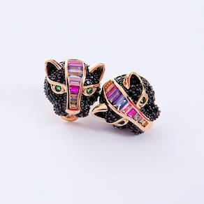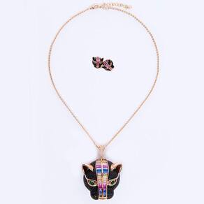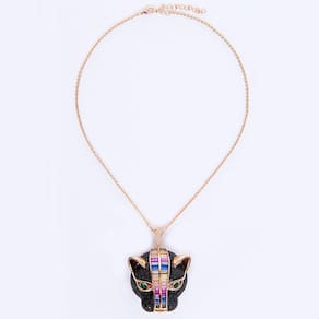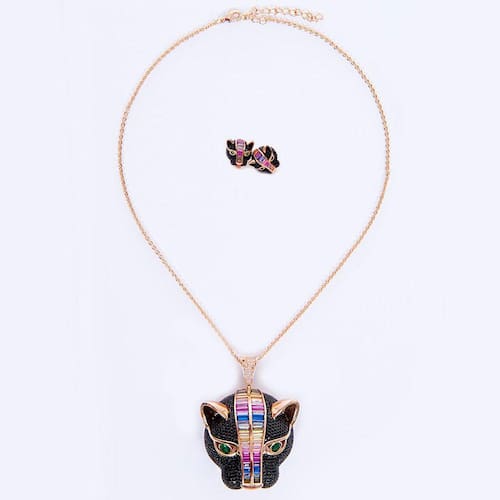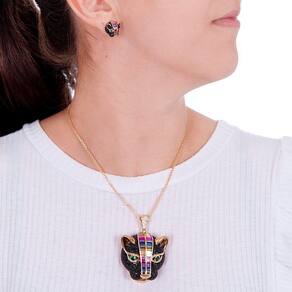 O conjunto se semijoia tigre cravejado com Zircônia pretas e baguetes coloridas é um colar luxuoso que te deixa em destaque em qualquer situação.