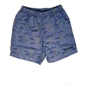 A camisetinha além de botões no ombro esquerdo para facilitar a troca tem um malha muito macia. A bermuda toda estampada com chaves é em poliéster.