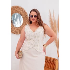 O Conjunto em Linho Bordado Plus Size é a escolha perfeita para quem busca elegância, conforto e sofisticação em uma única peça. Com design atemporal e delicado, ele une estilo e versatilidade para ocasiões especiais, eventos sociais e também para momentos de adoração e culto, sendo uma excelente opção no âmbito evangélico. O colete traz um caimento impecável, com decote em V, fechamento frontal por botões funcionais forrados e bordados exclusivos na parte frontal, que valorizam a silhueta feminina. Sua modelagem é levemente acinturada, proporcionando elegância e harmonia ao visual. A parte interna conta com forro 100% poliéster, garantindo conforto e segurança. A saia midi acompanha o conjunto e possui cós com elástico nas costas para maior conforto, zíper lateral invisível e barra bordada com detalhes sofisticados, que completam o look com delicadeza. Além disso, o forro interno oferece a cobertura ideal, mantendo discrição e bem-estar em qualquer ocasião. Confeccionado em 70% viscose e 30% linho, o conjunto possui toque leve, caimento fluido e frescor, ideal para estações mais quentes. É uma peça versátil que transita entre looks formais, sociais e evangélicos, sempre garantindo estilo e sofisticação. Especificações do Produto