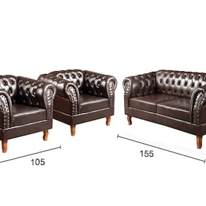 A entrega é realizada no térreo. Produto Montado: Sim Acompanha Almofadas extras: Não Almofada do assento: Removível Almofada do encosto: Não Possui Altura do assento até o chão: 41.0000 Altura do Encosto: 82 cm Ambiente Principal: Sala de Estar codigo_ean: 6015038761773 Complexidade da Montagem: Baixa: pode ser montado por uma pessoa sozinha Cor: Marrom Cor do Produto: Marrom Densidade do Assento: D-26 Enchimento do Assento: Espuma Estilo de Braço: Braços Redondos Firmeza do Assento: Macio Informações Complementares: 120Kg por acento Itens Inclusos: 1 Sofá 3 Lugares + 2 Poltronas (incluindo seus respectivos pés apenas pra enroscar) Linha ou Coleção: Chesterfield Necessita Montagem: Sim Origem do Produto: Nacional Peso: 76 kg Pet Friendly: Não Possui Percintas Elásticas: Sim Possui Pés: 04 Possui Rodízio: Não Quantidade de Itens: 3 Recomendações de Uso, Manutenção e Limpeza: Limpeza e cuidados: pode ser utilizado aspirador de pó, escova com cerdas macias ou limpeza a seco. Não utilizar produtos químicos, abrasivos ou limpeza a vapor. Evitar exposição prolongada ao sol. Sistema de Montagem: Enroscar os Pés Suporta Até (kg): 120 kg Tecido Predominante: Couro Sintético Tipo de Encosto: Fixo Tipo de Mola: Não Possui