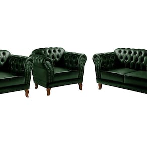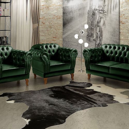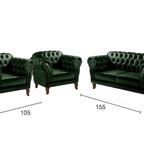 A entrega é realizada no térreo. Produto Montado: Sim Acompanha Almofadas extras: Não Almofada do assento: Removível Almofada do encosto: Não Possui Altura do assento até o chão: 41.0000 Altura do Encosto: 82 cm Ambiente Principal: Sala de Estar codigo_ean: 7909903715345 Complexidade da Montagem: Baixa: pode ser montado por uma pessoa sozinha Cor: Verde Cor do Produto: Verde Densidade do Assento: D-26 Enchimento do Assento: Espuma Estilo de Braço: Braços Redondos Firmeza do Assento: Macio Informações Complementares: 120Kg por acento Itens Inclusos: 1 Sofá 3 Lugares + 2 Poltronas (incluindo seus respectivos pés apenas pra enroscar) Linha ou Coleção: Chesterfield Necessita Montagem: Sim Origem do Produto: Nacional Peso: 76 kg Pet Friendly: Não Possui Percintas Elásticas: Sim Possui Pés: 04 Possui Rodízio: Não Quantidade de Itens: 3 Recomendações de Uso, Manutenção e Limpeza: Limpeza e cuidados: pode ser utilizado aspirador de pó, escova com cerdas macias ou limpeza a seco. Não utilizar produtos químicos, abrasivos ou limpeza a vapor. Evitar exposição prolongada ao sol. Sistema de Montagem: Enroscar os Pés Suporta Até (kg): 120 kg Tecido Predominante: Couro Sintético Tipo de Encosto: Fixo Tipo de Mola: Não Possui