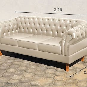 A entrega é realizada no térreo. Produto Montado: Sim Acompanha Almofadas extras: Não Almofada do assento: Removível Almofada do encosto: Não Possui Altura do assento até o chão: 41.0000 Altura do Encosto: 82 cm Ambiente Principal: Sala de Estar codigo_ean: 7909903691762 Complexidade da Montagem: Baixa: pode ser montado por uma pessoa sozinha Cor: Bege Cor do Produto: Bege Densidade do Assento: D-26 Enchimento do Assento: Espuma Estilo de Braço: Braços Redondos Firmeza do Assento: Macio Informações Complementares: 120Kg por acento Itens Inclusos: 1 Sofá 3 Lugares + 2 Poltronas (incluindo seus respectivos pés apenas pra enroscar) Linha ou Coleção: Chesterfield Necessita Montagem: Sim Origem do Produto: Nacional Peso: 75 kg Pet Friendly: Não Possui Percintas Elásticas: Sim Possui Pés: 04 Possui Rodízio: Não Quantidade de Itens: 3 Recomendações de Uso, Manutenção e Limpeza: Limpeza e cuidados: pode ser utilizado aspirador de pó, escova com cerdas macias ou limpeza a seco. Não utilizar produtos químicos, abrasivos ou limpeza a vapor. Evitar exposição prolongada ao sol. Sistema de Montagem: Enroscar os Pés Suporta Até (kg): 120 kg Tecido Predominante: Couro Sintético Tipo de Encosto: Fixo Tipo de Mola: Não Possui