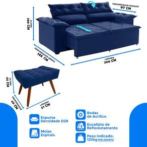 Ele possui encosto reclinável em cinco posições, proporcionando-lhe mais conforto na hora do descanso. E não para por aí: seu assento retrátil conta com espuma D28 e molas espirais, transformando seu sofá em uma verdadeira cama para assistir seu filme preferido.