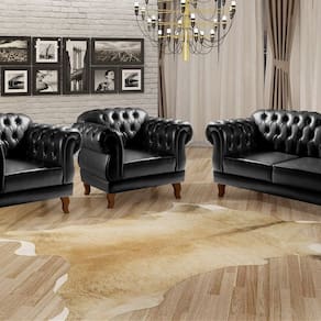 A entrega é realizada no térreo. Produto Montado: Sim Acompanha Almofadas extras: Não Almofada do assento: Removível Almofada do encosto: Não Possui Altura do assento até o chão: 0.0000 Altura do Encosto: 82 cm Ambiente Principal: Sala de Estar codigo_ean: 7909903850176 Complexidade da Montagem: Baixa: pode ser montado por uma pessoa sozinha Cor: Preto Cor do Produto: Preto Estilo de Braço: Braços Redondos Informações Complementares: 120Kg por acento Itens Inclusos: 1 Sofá 3 Lugares, 2 Poltronas Linha ou Coleção: Chesterfield Necessita Montagem: Sim Origem do Produto: Nacional Peso: 32 kg Pet Friendly: Não Possui Percintas Elásticas: Sim Possui Pés: 04 Possui Rodízio: Não Quantidade de Itens: 3 Recomendações de Uso, Manutenção e Limpeza: Limpeza e cuidados: pode ser utilizado aspirador de pó, escova com cerdas macias ou limpeza a seco. Não utilizar produtos químicos, abrasivos ou limpeza a vapor. Evitar exposição prolongada ao sol. Sistema de Montagem: Enroscar os Pés Suporta Até (kg): 120 kg Tecido Predominante: Couro Sintético Tipo de Encosto: Fixo Tipo de Mola: Molas Ensacadas (Molas ensacadas)