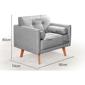 Medida do sofá 2 lugares: Altura 80 x Largura 140 x Profundidade 74 cm Medida da poltrona: Altura 80 x Largura 90 x Profundidade 74 cm Produto reforçado, armação em madeira, muito bem estofado Estrutura em madeira com espuma D26 Produto Seguro para até 120kg por assento