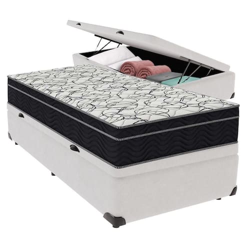 Base Box com Baú: Marca: KazaMix; Cor do Baú: Bege; Revestimento da Cama: Material Sintético; Material dos pés: Madeira; Estrutura: Madeira; Abertura: Pistão a gás; Peso máximo recomendado: até 150kg de cada lado; Altura do Baú: 32cm; Altura dos pés: 5cm; Altura total: 37cm; Garantia: 03 meses; Selo Ecologicamente Correto.