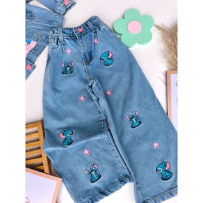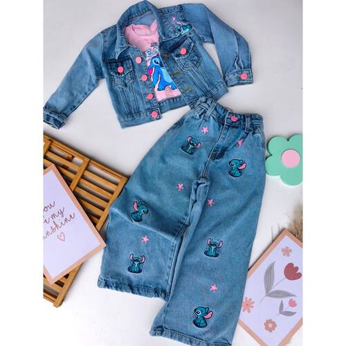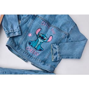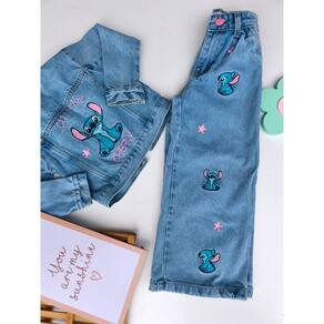 Conjunto Stitch jaqueta e calça jeans bordada sem elástano. Calça: Estilo e Elegância: A calça jeans wide leg bordada com o personagen Stitch é a escolha perfeita para meninas cheias de atitude! Com um ajuste moderno e bordados delicados e elástico na cintura, garante um visual único e cheio de charme.Conforto Garantido: Feita com tecido de qualidade, oferece liberdade de movimento sem abrir mão do estilo.Perfeita para toda ocasião: Ideal para passeios, festas ou até mesmo um dia casual com estilo. Atenção as medidas, modelagem grande!