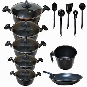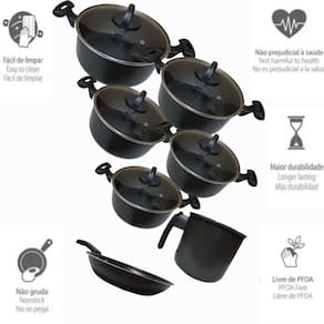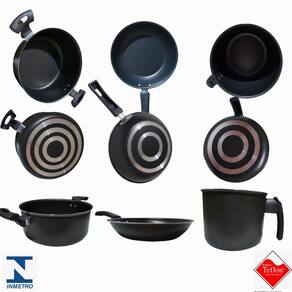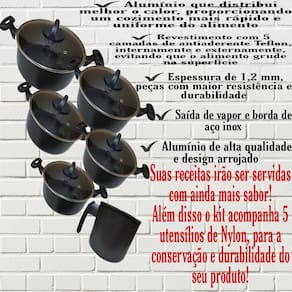 01 Panela Caçarola N24: Diâmetro de 24 cm 01 Panela Caçarola N22: Diâmetro de 22 cm 01 Panela Caçarola N20: Diâmetro de 20 cm 01 Panela Caçarola N18: Diâmetro de 18 cm 01 Panela Caçarola N17: Diâmetro de 17 cm 01 Caneco Teflon N14: Diâmetro de 14 cm
