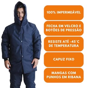 Japona térmica impermeável, produzida em nylon resinado, com manta 150 gr/m², botões de pressão e veIcro para fechamento frontal. Produto todo costurado com linha de nylon tex. 60, garantindo qualidade e durabilidade. Acabamento externo liso e acabamento interno matelado.