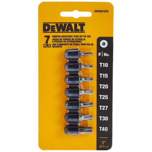 Conjunto Torx de segurança DeWalt DW2067SCR, 7 peças - Brocas modificadas S2 para maior durabilidade - Brocas Torx invioláveis de 2,5 cm: T10, T15, T20, T25, T27, T30, T40 - Conjunto de 7 peças para cobrir uma variedade de aplicações - País de origem: China