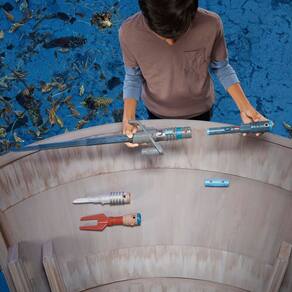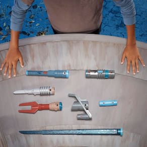 As crianças podem canalizar seu mandaloriano interior e montar 3 criações diferentes - o icônico Darksaber, uma baioneta elétrica e uma lâmina vibratória -