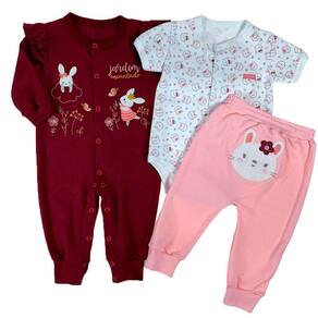 contém: - 1 body curto estampado coelhos; - 1 calça rosa com cós bordado coelho: - 1 macacão longo vermelho bordado coelho;