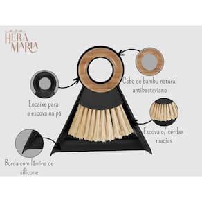 Características / medidas Dimensões: Pá: 17 x 5,8 x 19cm l x p x a Escova: 10 x 2 x 15cm l x p x a Cor: bambu e preto. Material: bambu e plástico.