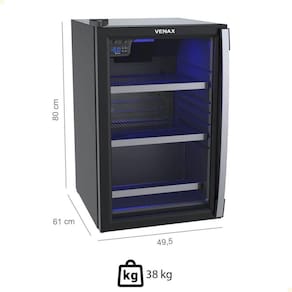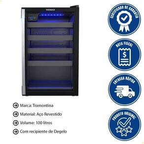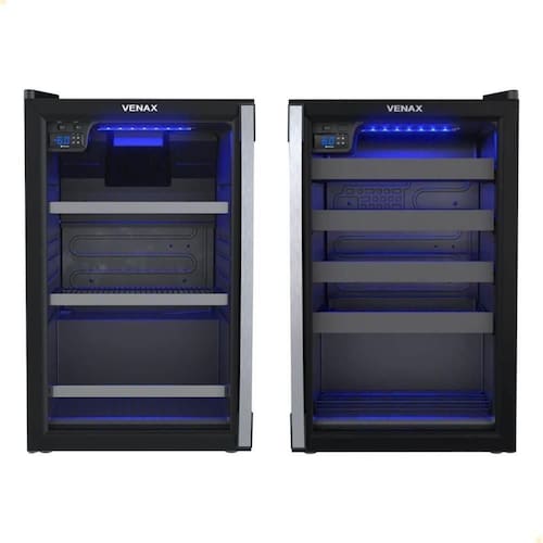 - A Cervejeira Expositora Venax 102L, com porta invertida e acabamento em preto fosco, oferece controle digital de temperatura (-6C a 6C), LED azul e vidro duplo com aquecimento ideal para manter suas bebidas sempre geladas.