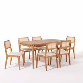 Desenvolvida para quem deseja mais acolhimento no decór, o conjunto Verona composto por 6 cadeiras com encosto de telinha e 1 mesa de tampo laminado de 1,60 é perfeita. Por ser produzida com madeira maciça de eucalipto reflorestado e acabamento Verniz mel, juntamente com o tecido claro na cor cru 06 , proporciona um ambiente com estilo luminoso, arejado e acolhedor. É Ideal para sua cozinha e sala de jantar, formando o ambiente perfeito para desfrutar junto de família e amigos uma refeição maravilhosa. Medida da Mesa (A x L x P): 76x160x90 Peso da Mesa: 30 kg Mesa suporta até: 50 kg Acabamento da Cadeira/Banco: Pintura Acabamento da Mesa: Verniz Acompanha Manual de Instalação: Não Ambiente Principal: Sala de Jantar Cadeira/Banco Estofada: Somente Assento Estofado Cadeira/Banco estofada: Somente Assento Estofado Cadeira/Banco Suporta Até: 120.0000 Cadeira/Banco suporta até: 120 kg codigo_ean: 7900288285737 Complexidade da Montagem: Baixa: pode ser montado por uma pessoa sozinha Configuração do Conjunto: Mesa com Cadeiras Cor: Verniz Mel/Cru Cor da Base: Bege Cor das Cadeiras: Bege Cor do Produto: Verniz Mel/Cru Cor do Tampo: Bege Cor Secundária: Bege De Canto (Canto Alemão): Não Escala de Brilho: Semi-Brilho Espessura do Tampo: 35 mm Formato do Tampo: Retangular Informações Complementares: Este produto foi pensado e desenvolvido para elevar a decoração do seu ambiente interno e trazer um ar de sofisticação para sua sala de jantar. É recomendado seguir as instruções de manutenção e acabamento que acompanham a embalagem. Itens Inclusos: 1 Mesa, 6 Cadeiras, Kit Ferragem e Manual de Montagem Linha ou Coleção: Verona Manual de Especificação Técnica: https://product-hub-prd.madeiramadeira.com.br/213523754/documents/33fb42c4-6f2e-4f89-9e49-d30943f4be793306650293217619167443304.pdf Manual de Montagem e Instalação: https://product-hub-prd.madeiramadeira.com.br/213523754/documents/f36cdc92-6d93-426a-b443-fb2664d7fa0b3306991293217619186895308.pdf Marca: Casa e Jardim Móveis Material da Base da Mesa: MDF Laminado/Madeira Maciça Material da Estrutura da Cadeira: MDF Laminado/Madeira Maciça Material do Tampo: Madeira/MDF Material Principal: Eucalipto Material Principal das Cadeiras/Bancos: Madeira Maciça Medida da Cadeira/Banco (A x L x P): 85x50x51 Medida do Tampo (L x C x E): 160x90x3,5 Mesa Extensível: Não Necessita Montagem: Sim Origem do Produto: Nacional Peso da Cadeira/Banco: 4,5 kg Possui Apoio para Braços: Não Possui Apoio Para os Pés: Não Possui Vidro: Não Quantidade de Cadeiras: 6 Quantidade de Lugares: 06 Recomendações de Uso, Manutenção e Limpeza: Utilizar em ambiente interno ,coberto. Os tampos das mesas são de MDF com encabeçamento em madeira maciça, evite molhar ou deixar líquidos por muito tempo para que não ocorra bolhas.o expor ao sol e chuva. Cuidados e limpeza : Retire o pó com uma flanela macia, seca ou levemente umedecida. Passe uma esponja macia e levemente umedecida. Não utilizar álcool ou produtos químicos, abrasivos ou solventes. Sistema de Montagem: Parafusos para a mesa , pois as cadeiras ja vão montadas Tipo de Encosto: Fixo