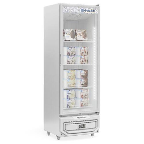 Conservador Vertical Porta de Vidro GPF45LP Gelopar. Conservação e exposição de sorvetes e produtos congelados. Controle de Temperatura: Controlador eletrônico com indicador de temperatura. Refrigeração: Ar forçado com evaporador aletado. Temperatura: -16° a -20°C. Degelo: Automático. Iluminação: 2 barras de LED internas (perimetral). Porta: Vidro duplo temperado baixo emissivo, com sistema de aquecimento. Fechamento automático. Prateleiras aramadas: 3 níveis reguláveis e inclináveis + estrado. Compressor Inverter. Gabinete com rodízios. CAPACIDADE: 578 Litros. ARMAZENAGEM: 80 potes de sorvete 2l. CONSUMO: 12,2kWh/dia. PESO: 124kg. DIMENSÕES EXTERNAS(CxAxL): 67,5x201,1x82,7cm. Equipamento certificado conforme Portaria Inmetro nº 371/2009. Conservador Vertical Porta de Vidro GPF45LP Gelopar é na Atau.