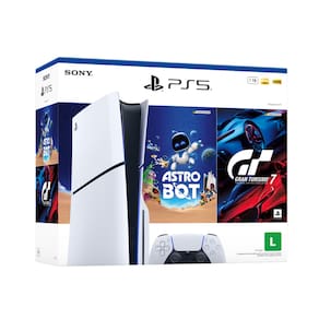 JOGUE COMO NUNCA ANTES™ Console PlayStation®5 - pacote ASTRO BOT e Gran Turismo 7 (grupo de modelos - slim)* libera ainda mais possibilidades de jogo. Este pacote de ótimo custo-benefício inclui dois exclusivos PlayStation muito celebrados da PlayStation Studios: ASTRO BOT e Gran Turismo 7. Aproveite o carregamento extremamente rápido com o SSD de altíssima velocidade, uma imersão mais profunda com suporte a resposta tátil, gatilhos adaptáveis e áudio em 3D2, além de uma geração inédita de jogos incríveis para PlayStation®. Na velocidade da luz domine o poder de uma CPU e GPU personalizadas e o SSD com E/S integradas que redefinem as regras do que o console PlayStation® pode fazer. Jogos impressionantes maravilhe-se com os gráficos incríveis e experimente os recursos do novo PS5®. Jogue o catálogo de jogos compatíveis com o PS4™. Imersão de tirar o fôlego Descubra uma experiência de jogos mais profunda com compatibilidade com feedback tátil, gatilhos adaptáveis e tecnologia de áudio em 3D 2 .