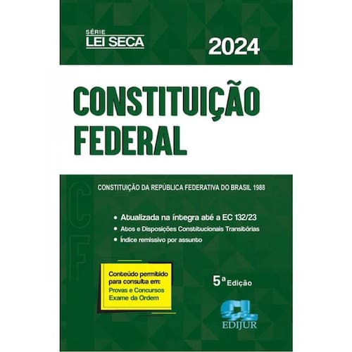 CONSTITUIÇÃO FEDERAL – Série Lei Seca Atualizada até a Emenda Constitucional nº 132 (Reforma Tributária) Incluso a ADCT - Atos das Disposições Constitucionais Transitórias - 354 págs - Lei seca (íntegra do texto) Tamanho: 12 x 18 cm DESCRIÇÃO INTERNA: - Artigos em destaque no cabeçalho - Fonte em tamanho padrão de livro - Possui folhas especiais para não transferir marcações NOVIDADE: ÍNDICE REMISSIVO POR ASSUNTO == Fechamento da Edição == Atualizado até 26/01/2024 Conteúdo permitido para consultas em: - Provas - Concursos - Exame da Ordem