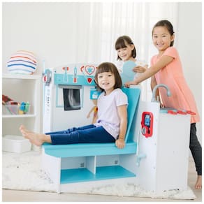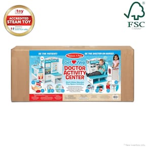 Este espaço de recreação de madeira é uma ótima maneira para as crianças aliviarem o medo em relação às consultas médicas e incentivarem brincadeiras carinhosas e empáticas. O produto inclui uma área de espera com assento, relógio e obras de arte divertidas e mutáveis. Há também uma sala de exames com uma pia, monitor de pressão arterial com manguito ajustável, 2 raios X para exibição, balança com peso móvel, barra de altura ajustável, gráfico ocular, ganchos e suportes móveis para ferramentas, bomba desinfetante e cartão reversível para janela de diploma. O produto possui muito espaço de armazenamento, é fácil de montar e inclui instruções ilustradas chave de fenda Phillips necessária, Este produto é certificado pelo Forest Stewardship Council, garantindo que os produtos provêm de florestas geridas de forma responsável que proporcionam benefícios ambientais, sociais e económicos, e que as florestas são protegidas para as gerações futuras. Observe que a certificação FSC se aplica apenas ao novo inventário FSC C156584. Este produto é recomendado para crianças a partir de 3 anos.