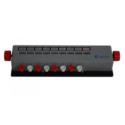 O contador manual de células sanguíneas é um instrumento utilizado em laboratórios de análises clínicas, especialmente na área de hematologia. Com estrutura externa moldada em plástico ABS resistente e base e mecanismo interno em metal, o contador manual de células sanguíneas possui 8 teclas e botões nas duas extremidades para zerar a contagem. Dados Técnicos Principais: Estrutura externa moldada em plástico ABS resistente; Base e mecanismo interno fabricados em metal; Possui 8 teclas e botões nas duas extremidades para zerar a contagem; Registros de contagem com 3 dígitos e registro totalizador, ambos com alcance até 999; Registros de Contagem: Basófilos/Eosinófilos/Linfócitos/Mielócitos/Monócitos/Neutrófilos/Plaquetas/Segmentados; Indicador sonoro quando a contagem no registrador alcançar o valor 100; Os registros individuais indicam os percentuais; Pode ser operado com a mão direita ou esquerda; Dimensões mm : 275 x 60 x 40.