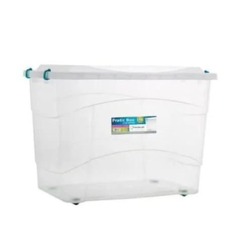 Caixa organizadora transparente com tampa e travas com capacidade para 150L.