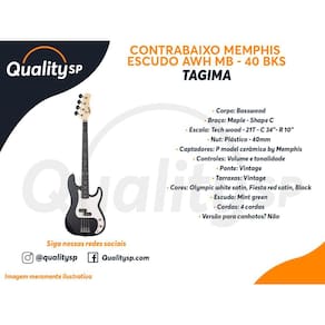 Especficações Técnicas: • Contra-baixo: passivo • Quantidade de cordas: 4 • Corpo: Basswood • Braço: Maple - Shape C • Escala: Tech wood - 21T - C 34”- R 10” • Nut: Plástico - 40mm • Ponte: Vintage • Tarraxas: Vintage • Captação: P model cerâmico by Memphi • Controles: Volume e tonalidade • Cor: Black Satin • Escudo: Aged white