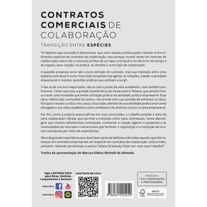 Sobre a obra Contratos Comerciais de Colaboração - Transição Entre Espécies - 1ª Ed - 2025 “O objetivo aqui buscado é demonstrar que umarelação jurídicapode transitar entre diferentes espécies decontratos de colaboração. Isso porque, muitas vezes um contrato de colaboração nasce sob a natureza jurídica de um tipo contratual e no decorrer do tempo e do espaço, essa relação, na prática, se amolda a outro tipo de colaboração. A questão proposta seria não a pura extinção do contrato, mas sua transição entre uma espécie contratual e outra. Essa visão proposta visa agilizar as relações, manter a atividade empresarial e resolver questões práticas que venham a surgir. Para buscar essas conclusões, a obra teve que enfrentar a definição de contratos comerciais de colaboração, suas espécies, as modalidades de contratos de colaboração, as regras que tipificam esses contratos. Tratou-se ainda doscontratos de agência,mandatoecomissão mercantil,contratos de distribuição(Lei Ferrari) econtratos de franquia. Enfim, os principais contratos de colaboração foram estudados no decorrer do trabalho. Após esse estudo dos contratos de colaboração enfrentou-se as regras e princípios contratuais que devem nortear esses contratos, justamente para demonstrar as semelhanças entre eles capazes de permitir essa fluidez proposta entre as espécies de contratos. Trata-se de um livro importante, não só sob o ponto de vista acadêmico, mas também profissional. Talvez seja essa a grande característica da nossa autora Tatiana, que sempre busca trazer uma novidade que tenha utilização prática na atividade jurídica empresarial. Essa obra, reflexo das conclusões da autora, nos brinda com sua vontade de enfrentar os desafios que o mundo jurídico nos coloca. Essa visão advinda de sua atividade profissional como advogada e sua visão acadêmica como professora de diversos cursos na área empresarial. Por fim, como a própria autora afirma em suas conclusões, o trabalho propõe a ideia de umacolaboração hibrida, que permite a transição entre tipos contratuais, numa abordagem que envolve aditamentos contratuais, mantendo a relação vigente e ajustando-a às necessidades do mercado e mecanismos que facilitam a negociação e a resolução de lacunas contratuais por meio de especialistas. Obra de grande importância que deve fazer parte da biblioteca de todos aqueles que têm interesse em contratos empresariais, em especial nos contratos de colaboração. Leitura indispensável, restando parabenizar a autoraTatiana Dratovsky Sisterpor mais esse trabalho!” Trecho da apresentação deMarcus Elidius Michelli de Almeida