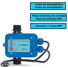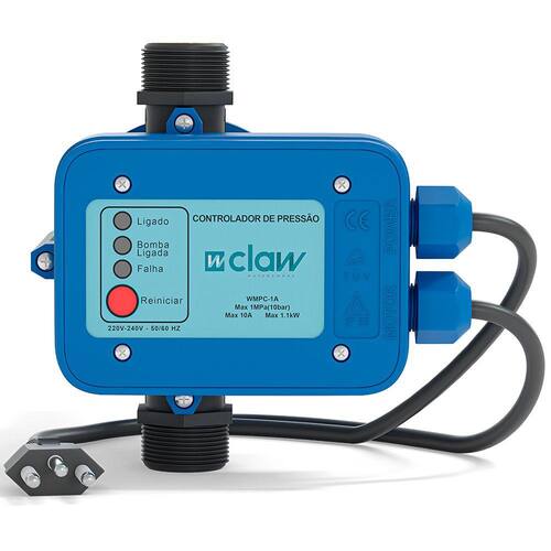 Controlador De Pressão Ajustável 1,5cv WMEPC-1A Rosca 1 ClawIndicado para automatização de sistemas de abastecimento e pressurização. Controlador 1,5cv Claw é compacto e de fácil instalação, compatível com vários modelos de bombas, possui regulagem de pressão para acionamento da motobomba.Vantagens:- Corpo em termoplástico- União em termoplástico- Placa eletrônica de comando- Grau de proteção IP65- Conexão: 1 rosca BSP.Especificação Técnica:- Temperatura ambiente: Máximo + 40°C- Temperatura da água: Máximo +60ºC- Corrente da motobomba: Máximo 10A- Potência da motobomba: Máximo 1,5 cv- Pressão da motobomba: Minimo 1,5bar (15 m.c.a)- Pressão da motobomba: Máximo 10bar (100 m.c.a).- Frequência: 60HzMedidas do produto:Altura: 18cmLargura: 17cmComprimento: 23cmPeso: 1,6KgConteúdo da embalagem:01 Controlador De Pressão WMEPC-1A Claw01 Manual de instrução*Garantia: 12 meses contra defeitos de fabricação.*Objetos de decoração das fotos não estão inclusos.*As cores podem variar conforme monitor/smartphone utilizado para a visualização do anúncio.*Não oferecemos serviço de montagem dos produtos, porém, acompanham esquema de montagem na embalagem.*Recomendamos que o serviço seja feito por um profissional.