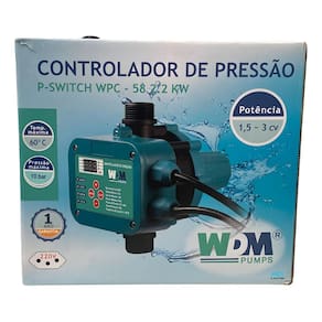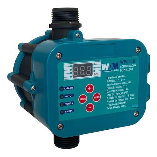 - Liga / Desliga Automático - Válvula de retenção incorporado - Ausência Vaso de Expansão - Display Digital (Pressão em tempo real) - Pressão do Sistema Auto Ajustável conforme cada Bomba - Não necessita de Parametrização - Proteção contra trabalho à seco - Proteção contra Sobre tensão e Sobre pressão - Religamento automático - Após longo tempo sem operação, o sistema aciona protegendo contra o travamento da bomba - Poderá utilizar o controlador Press com motores trifásicos através de contatora. - Utilizado para água limpa até temperatura de 40ºC. - Pressão máxima de 90mca - Vazão máxima de 5m³/h. - Grau de Proteção IP-65. - Frequência de 50/60HZ.
