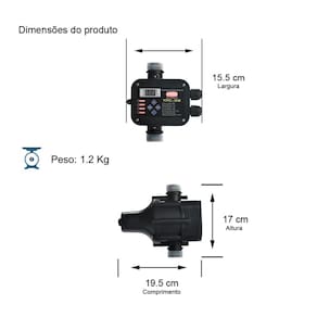 Controlador automático de pressão, necessita ser instalado/rosqueado no recalque de bombas com motores Monofásicos até 3,0 cv em 220 V ou até 1,0 cv em 127 V para pressurização de residências, construção civil e de equipamentos em geral compatíveis com as caraterísticas do produto. Possui as funcionalidades: liga/Desliga automaticamente; válvula de retenção incorporada; ausência de vaso de expansão; display digital; pressão do sistema auto ajustável conforme cada bomba; não necessita de parametrização; proteção contra trabalho a seco; proteção contra tensão e sobre pressão; Religamento automático; sistema contra travamento da bomba, devido após longo tempo de utilização acionar o equipamento. Utilizado para água limpa até temperatura de 40ºC com vazão máxima de 5m³/h e pressão máxima de 90mca. OBS.: O modelo de bomba a ser utilizado deverá estar condizente com os dados de projeto na qual será instalado. Construído em termoplástico. Válvula de retenção em latão.