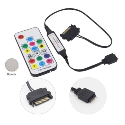 Controladora ARGB Cooler Fan 3 Pinos 5V Conexão Sata Fonte DESCRIÇÃO:Modelo: RF 17 Tipo de LED: ARGBConexão do LED: 3 pinosTipo de conexão: SATA ligado na fonte Alcance: Max. 10 metrosMaterial: PlásticoComprimento cabo: 40cmTensão: 5VBateria: CR2025 CONTEÚDO DA EMBALAGEM:01x Controlador RGB01x Controle Remoto01x Plug extra macho/macho01x Bateria ATENÇÃO: Acompanha bateria, porém pode estar descarregada devido ao tempo de armazenamento