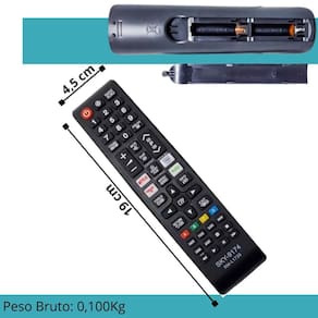 Descrição do anúncio: Conteúdo da embalagem: 1 controle remoto universal compatível com tv 2 pilhas aaa Características: Material de alta qualidade Teclas macias Plástico resistente Led transmissor com excelente tempo de resposta Funciona com todos os modelos de tv sem necessidade de configuração Especificações: Modelos compatíveis: bn5901199f Composição: plástico e teclas de borracha Dimensões: 18 cm a x 5 cm l Alimentação: 2 pilhas aaa 1.5v Cor: preto Homologação: 025011103596 Principais perguntas sobre o produto e respostas: 1 este controle funciona com todas as tvs samsung Sim, o controle é compatível com todos os modelos de tv samsung, incluindo tubo, plasma, lcd e led. 2 preciso configurar o controle antes de usar Não, o controle funciona de forma simples e completa sem necessidade de configuração. 3 as pilhas estão incluídas no pacote Sim, o controle vem com 2 pilhas aaa. Homologação Anatel: 112572013224 Marca: Lippin