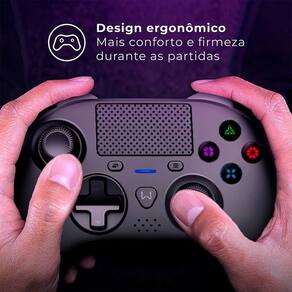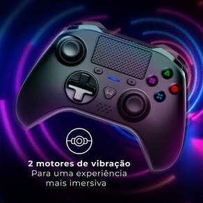 Seu design ergonomico proporciona firmeza e conforto mesmo nas sessoes mais longas, enquanto os dois motores internos de vibracao elevam a imersao com feedback tatil realista, ideal para jogos de acao, aventura e esportes. O Touchpad integrado e a iluminacao gamer acrescentam modernidade e funcionalidade ao controle, tornando o setup ainda mais completo.
