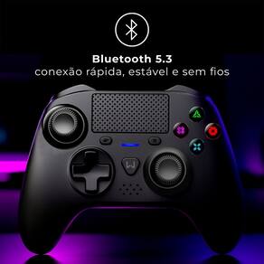 Com Bluetooth 5.3, a conexao e rapida, estavel e com baixo consumo de energia. A bateria recarregavel de 1000mAh garante longas horas de jogo sem interrupcoes, e a entrada auxiliar P2 -3,5 mm- permite conectar fones com microfone diretamente ao controle, assegurando foco total nas partidas.