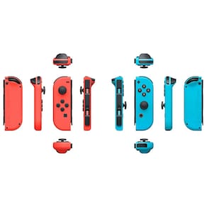 Cada Joy-Con conta com todos os botões e pode servir como um controle individual. Cada um deles inclui um acelerômetro e giroscópio, possibilitando controle de movimento na direita e na esquerda.